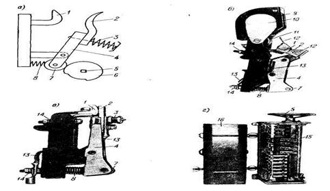 Контроллеры строятся трех типов: плоские, барабанные и кулачковые. Плоские контроллеры могут конструктивно выполняться на большее число ступеней по сравнению с барабанными и кулачковыми, но переключающая способность их меньше, чем у последних. Они применяются в случаях, когда требуется большое число ступеней, а также для одновременного управления и регулирования в нескольких электрических цепях при малых токах редких переключениях. Неподвижные контакты размещаются на плоской панели. Подвижные контакты укреплены на траверсе, перемещаемой ходовым винтом. Привод может быть ручной или двигательный (для дистанционного управления). Для повышения переключающей способности контроллеров применяются вспомогательные контакторы, управление которыми сблокировано с ходом траверсы. При переходе щетки с контакта на контакт контактор отключает цепь, переход происходит без тока. После установки траверсы на новом контакте контактор снова включает цепь. Барабанные контроллеры применяются для управления двигателями мощностью до 45 кВт постоянного тока и 75 кВт переменного тока. Переключающая способность их невелика. Они допускают 120 (максимум 240) переключений в час. Невысокая переключающая способность, большой износ трущихся поверхностей контактов ограничивают их применение. Барабанные контроллеры заменяются на более совершенные кулачковые. Кулачковые контроллеры (рис. 17-9) допускают до 600 включений в час. Они могут выполняться на большие токи по сравнению с барабанными. Контактное устройство их работает аналогично контактному устройству контакторов, т. е. каждый коммутационный элемент снабжается дугогасительной системой. Поэтому они обладают высокой отключающей способностью. Управление контактами осуществляется фигурным кулачком. Передача движения через вращающийся ролик обеспечивает малый износ. Возможные выполнения: 1) контакты замыкаются кулачком, а размыкаются пружиной; 2) контакты замыкаются пружиной, а размыкаются кулачком; 3) контакты замыкаются и размыкаются кулачком. Размыкание пружиной обеспечивает более высокую отключающую способность, а размыкание кулачком – разрыв контактов в случае их приваривания, что не всегда достигается при отключении пружиной, т. е. размыкание кулачком более надежно. Замыкание и размыкание контактов кулачком требуют установки двух кулачков, а следовательно, усложнения конструкции и увеличения габаритов. Более широкое распространение получил вариант, в котором контакты замыкаются пружиной, а размыкаются кулачком.