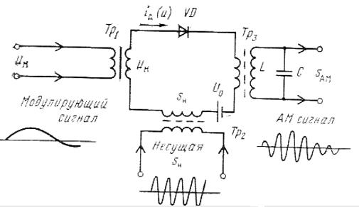 Рисунок 14.1 – Принципиальная схема диодного амплитудного модулятора. Напряжение модулирующего сигнала