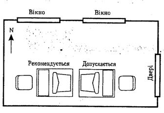 Вимоги до обладнання та організації робочого місця працюючих з ПК Розміщення робочих місць користувачів ПК повинно відповідати «Державним санітарним правилам і нормам влаштування і обладнання кабінетів комп'ютерної техніки в навчальних закладах та режиму праці учнів на персональних комп'ютерах» (ДСанПіН 5.5.6.009-98), ГОСТ 12.3.032-78, ГОСТ 21889-76, ГОСТ 22269-76. Конструкція робочого місця користувача ПК має забезпечити підтримання оптимальної робочої пози. Робочі місця з ПК слід так розташовувати відносно вікон, щоб природне світло падало збоку переважно зліва (рис. 3.3). Робочі місця з ПК повинні бути розташовані від стіни з вікнами на відстані не менш 1,5 м, від інших стін – на відстані 1 м, відстань між ними має становити не менш ніж 1,5 м. При розміщенні робочого місця поряд з вікном кут між екраном дисплея і площиною вікна повинен складати не менше 90° (для запобігання відблискам); частину вікна, що прилягає, бажано зашторити. Недопустиме таке розташування ПК, при якому працюючий повернений обличчям або спиною до вікон кімнати або до задньої частини ПК, в яку монтуються вентилятори. При розміщенні робочих столів з ПК слід дотримуватись таких відстаней: між бічними поверхнями ПК – 1,2 м, від тильної поверхні одного ПК до екрана іншого ПК – 2,5 м (рис. 3.4).
