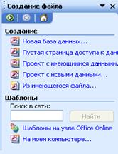 Глава 8. Технология работы с базой данных в ACCESS 8.1. Технология создания файла базы данных Приложение Microsoft Access запускается стандартным способом с помощью команды Пуск/Программы/ Microsoft Office/ Microsoft Access. Для создания файла базы данных выполняется команда Файл/Создать из меню окна приложения Access и в появившейся с правой стороны экрана панели Создание файла (рис.8.1.) выбираетсястрока Новая база данных.
