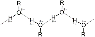 Спирты нормального строения кипят при более высокой температуре, чем спирты с разветвленной цепью. При одинаковом числе углеродных атомов первичные спирты кипят при более высокой температуре, чем вторичные, а вторичные — при более высокой температуре, чем третичные. Например, температура кипения бутиловых спиртов С4Н9ОН: нормального 117,7 °С, изобутилового 107,3 °С, вторичного 99,5 °С и третичного 82,8°С. Температура плавления, наоборот, выше у третичных спиртов. Плотность спиртов меньше 1. Температура кипения спиртов значительно выше температуры кипения соответствующих углеводородов и даже галогенопроизводных. Например, этан кипит при —88,3 °С, бромистый этил С2Н5ВГ — при +38,0 °С, а этиловый спирт — при +78,3 °С. Это различие обусловлено тем, что спирты, как и вода, хотя и в меньшей степени, являются ассоциированными жидкостями. Отдельные молекулы спиртов соединяются между собой с помощью так называемых водородных связей, возникающих между водородными и кислородными атомами гидроксильных групп различных молекул спирта (с участием неподеленных пар электронов кислорода):