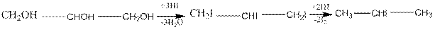 В реакции с иодистым водородом могут быть замещены все гидроксильные группы глицерина, но образующийся при этом трииодпропан восстанавливается иодистым водородом в иодистый изопропил: