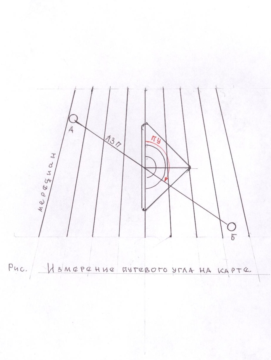 Для измерения путевого угла необходимо: а) соединить прямой линией заданные пункты полета; б) направить прямой угол транспортира в сторону полета, наложив его на серединку пути шкалой 0º - 180º параллельно ближайшему меридиану; в) прочесть значение угла по шкале транспортира в месте ее пересечения с линией пути. Если прямой угол транспортира направлен на восток, то путевые углы имеют значения 0º - 180º, если на запад, то 180º - 360º. Путевые углы измеряются на средних участках маршрута, потому что меридианы сходятся к полюсам, а не параллельны друг другу в силу чего в начале пути и в конце его путевые углы будут различными. Чтобы уменьшить их разность и производят измерения путевых углов от среднего меридиана. Маршрут выбирают такой длины, чтобы угол схождения меридианов в начале и в конце маршрутов не превышал 2º - 3º.