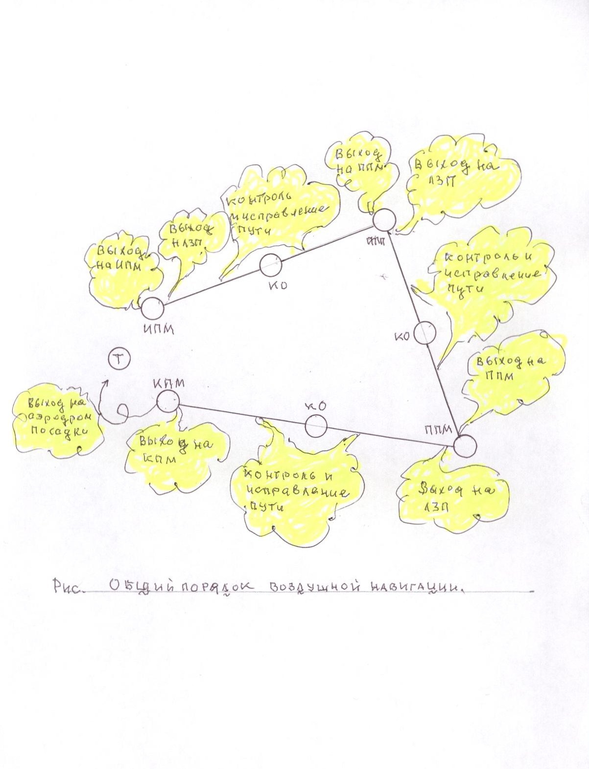 Общий порядок воздушной навигации. Процесс воздушной навигации слагается из отдельных составных частей (этапов), последовательное решение которых обеспечивает успешное выполнение полета по маршруту в целом. Этапы воздушной навигации: Ø взлет; Ø выход на ИПМ; Ø выход на ЛЗП; Ø контроль и исправление пути; Ø выход на КПМ (ППМ); Ø выход на аэродром посадки и производство посадки. Задачей экипажа является определение рациональных способов воздушной навигации, используя, при этом, те средства воздушной навигации, которые наилучшим образом соответствует конкретным условиях полета для решения задачи. В общем виде общий порядок воздушной навигации графически выглядит: