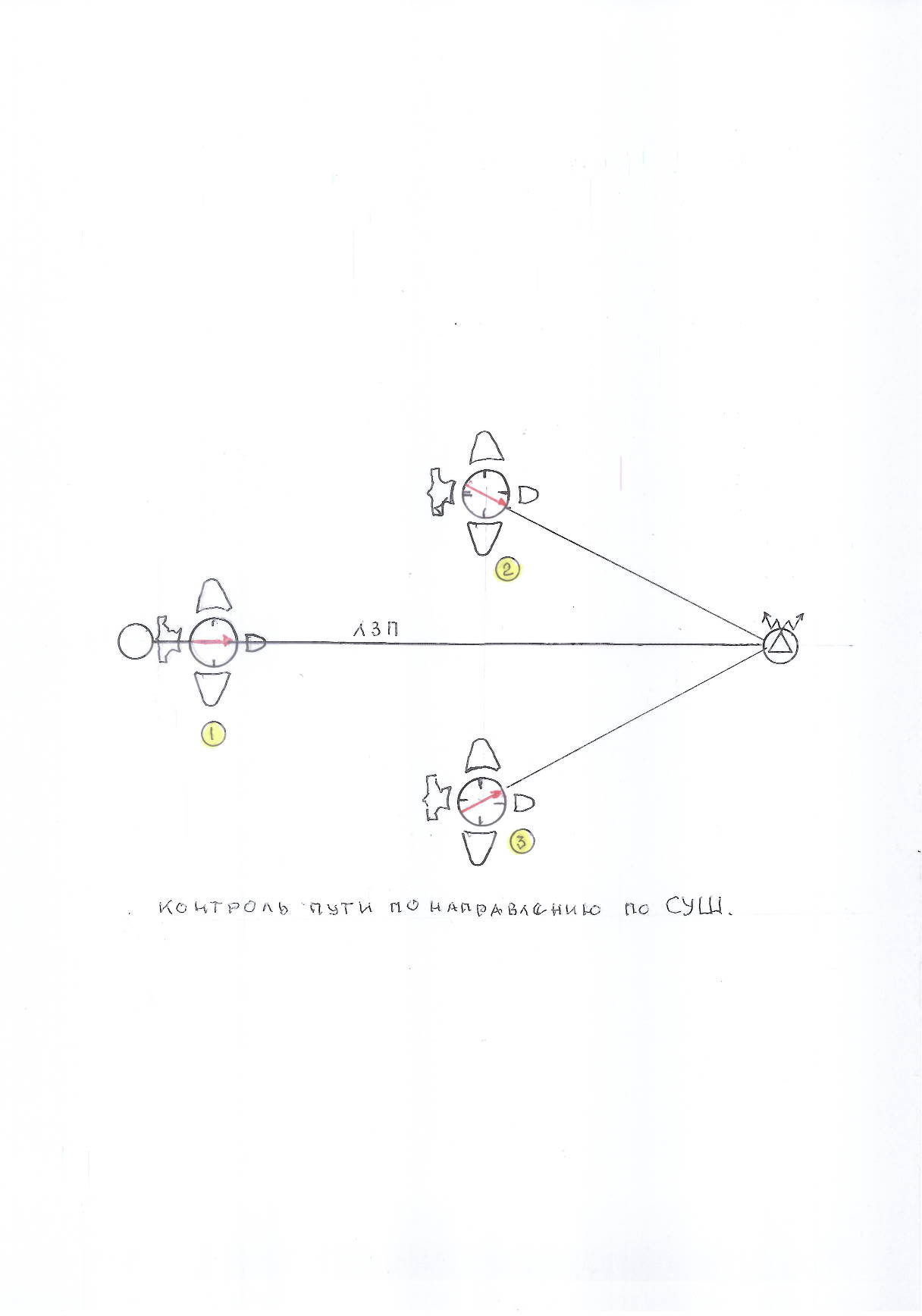 Контроль пути по направлению по СУШ При нахождении воздушного судна на ЛЗП стрелка СУШ установится острым концом в направлении радиостанции на значении равном УСр, т.е. в плоскости ЛЗП. Если в дальнейшем стрелка продолжает находится в этом положении в пределах ±2º, то воздушное судно находится на ЛЗП (поз.1). Если в процессе полета стрелка поворачивается вправо более 2º от первоначального положения, то это указывает на то, что воздушное судно уклонилось влево (поз.2). Если в процессе полета стрелка поворачивается влево более 2º от первоначального положения, то это указывает на то, что воздушное судно уклонилось вправо (поз.3). При чем отклонение стрелки от первоначального положения от плоскости ЛЗП дает величину ДП. Порядок работы: 1. Выйти на ЛЗП с МКр или МК= ЗМПУ. Включить секундомер. 2. Через 5-15 минут полета установить рукояткой "КУРС" на СУШ значение МК и против острого конца стрелки снять значения МПР. 3. Сравнением МПР с ЗМПУ осуществить контроль пути: если ЗМПУ = МПР - воздушное судно на ЛЗП (поз1), если ЗМПУ < МПР - воздушное судно уклонилось влево (поз.2), если ЗМПУ > МПР - воздушное судно уклонилось вправо (поз. 3).