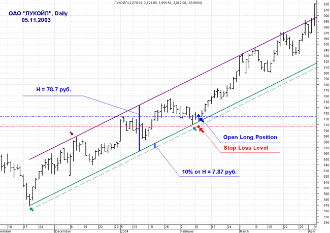 Ориентиром для определения величины стоп – лосса может служить величина примерно равная 10% от ширины ценового канала. У линии сопротивления в нисходящем канале следует продавать, прибыль фиксируется в районе линии канала. Стоп – лосс надо ставить чуть выше линии сопротивления. Не следует у границы ценового канала автоматически открывать позицию в противоположном направлении, так как тенденция может прийти к линии тренда и по горизонтали, более того – она может прорвать границу канала наружу. То есть, для того чтобы торговать против направления действующей тенденции, необходимо иметь некоторый багаж знаний и опыта.