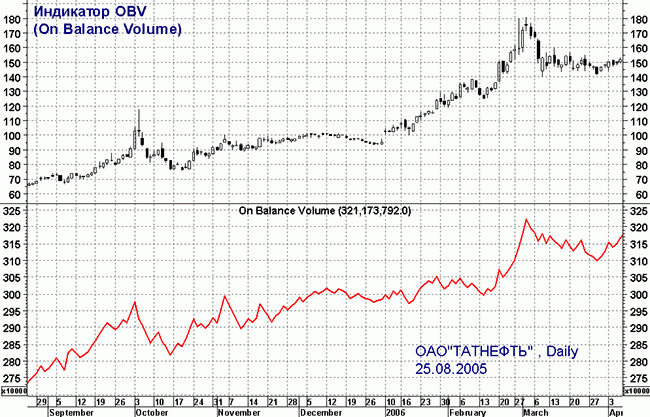 Индикаторы, основанные на объеме, дают сигналы точнее по времени, чем только объем. Индикатор OBV (On Balance Volume), Индекс Силы (Force Index) и прочие включают данные об объеме. Индикатор OBV (On Balance Volume), разработанный Джозефом Гранвиллем (Joe Granville), связывает объем с изменением цены. Он рассчитывается путем суммирования дневных объемов в общее значение, если цена закрытия растет, и наоборот дневной объем вычитается из общей, если цена закрытия снижается. Это помогает определить направление потока объема: на рынок или из него. При неизменных конечных ценах OBV остается прежним.
