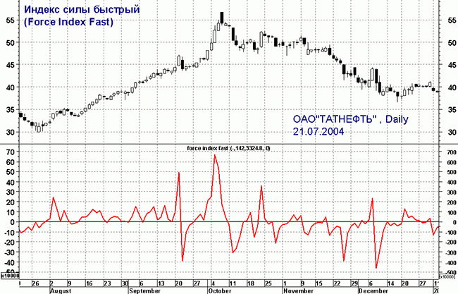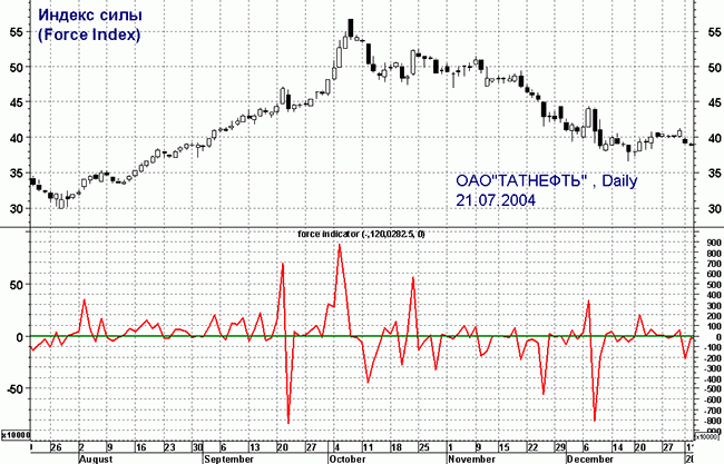 Индекс силы (Force Index) разработан Др. Александром Элдером (Dr. A. Elder). Он измеряет силу "быков" при каждом подъеме и силу "медведей" при каждом спаде цен. Индекс силы комбинирует три вида данных о рынке: направление движения цен, его размах и объем сделок. Он дает новый удобный способ использования данных об объеме при принятии решений.