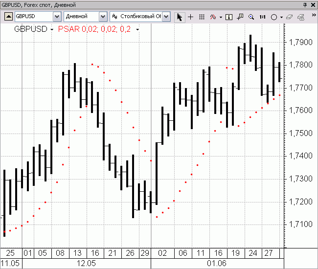 Если на рынке развивается бычий тренд, то точки SAR будут ежедневно (для дневного графика) перемещаться вверх, вслед за ценой, до тех пор, пока один из минимумов не опустится ниже своей точки SAR. Величина перемещения точек SAR зависит от величины ценового движения. Если минимум бара окажется ниже своей точки SAR, то точка будет отображаться не снизу, а сверху, над максимумом бара. На последующих барах точки SAR будут формироваться выше максимумов баров, неуклонно приближаясь к ним, до тех пор, пока один из максимумов не окажется выше точки. С этого момента, точки SAR будут отображаться под минимумами баров. На рисунке видно, что точки SAR попеременно формируются то над барами, то под барами, в зависимости от направления текущего тренда.
