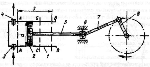 Принципиальная схема поршневого компрессора (рис. 3.1) включает цилиндр 1, поршень 2, всасывающий 3 и нагнетательный 4 клапаны, шток 5 и кривошипно-шатунный механизм, состоящий из крейцкопфа 6, шатуна 7 и кривошипа 8.