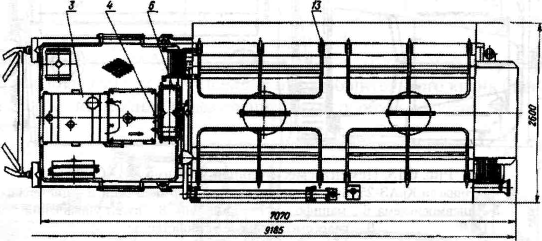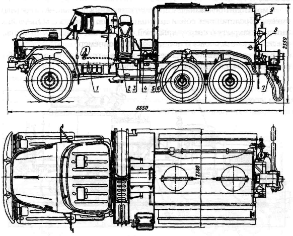 Рис. 6.17. Смесительная установка УС5 - 30: 1 - автошасси КрАЗ-250; 2 -коробка отбора мощности с карданным валом; 3 - ротационный компрессор РКВН-6/1; 4 - пневмосистема разгрузки и загрузки тампонажного материала; 5 - продуктопровод; 6 - бункеры; 7 - система управления; 8 - сепаратор; 9 - приемная воронка
