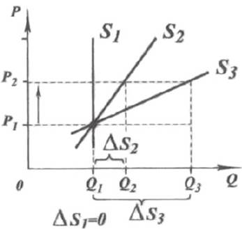 Рис. 16. Виды эластичности предложения по цене в зависимости от фактора времени: S1 - предложение при мгновенной реакции; S2 - в краткосрочном периоде; S3 - в долгосрочном периоде
