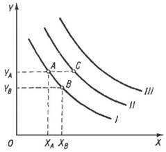 В отличие от кардиналистской теории полезности ординалистский подход к анализу потребительского поведения является наиболее современным и не требует точного количественного измерения полезности. В основе возможность сопоставления и сравнения различных потребительских наборов с точки зрения их предпочтительности для данного потребителя. Полезность в ординалистской теории (с точки зрения порядкового подхода) - субъективная полезность, или удовлетворение, которую потребитель получает из потребляемого им блага, измеренная по порядковой шкале29. Исходным инструментом анализа потребительских предпочтений становятся кривые безразличия. Кривая безразличия - это множество точек, каждая из которых представляет собой такой набор из двух товаров, что потребителю безразлично, какой из этих наборов выбрать. Если заполнить двухмерную плоскость кривыми безразличия так плотно, как это возможно, получим карту безразличия. На рис. 18 товарный набор А включает ХА единиц товара X и YA единиц товара Y, товарный набор В включает Хв единиц товара X и YB единиц товара Y. Если с точки зрения данного потребителя наборы А и В равноценны, то точки А и В лежат на одной и той же кривой безразличия30.