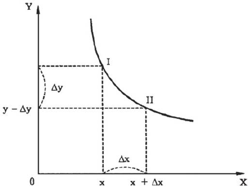 Если на оси абсцисс мы отложим количество единиц блага X, а на оси ординат - количество единиц блага Y, то отношение -∆Y/∆Х или — dy/dx характеризует предельную норму замещения (или субституции) Y на X (рис. 32):