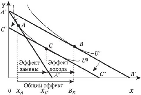 Рис. 26. Эффекты дохода и замены, по Хиксу, для нормальных благ (цены ↓) На рис. 26 потребитель выбирает набор товаров А на первоначальной линии бюджетного ограничения А 'А ". Если цена товара X упадет, то уменьшение Рх повернет бюджетное ограничение в положение А'В' и потребитель сможет приобрести товарный набор, соответствующий точке В. Однако если при падении цены товара X одновременно снизится доход потребителя, то линия бюджетного ограничения сдвинется из положения А'В' в положение С'С", и товарный набор максимальной полезности потребителя будет соответствовать точке С, которая находится на первоначальной кривой безразличия. Таким образом, перемещение вдоль кривой безразличия U0 из точки А в точку С представляет собой эффект замены. Уменьшение цены товара X вынуждает покупателя заменять больше товара Х на меньшее количество товара Y. Перемещение потребления из точки С в точку В выражает эффект дохода. Общий эффект от понижения цены товара равен сумме эффекта замены и эффекта дохода. Для нормальных товаров эффект замены и эффект дохода действуют в одном направлении (обратном к изменению цены).