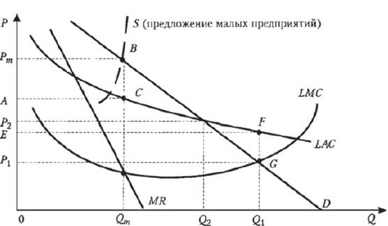 На рис. 54 экономические условия, приводящие к естественной монополии, изображены при помощи кривых спроса (D), предельного дохода (MR), средних долгосрочных издержек (LAC) и долгосрочных предельных издержек (LMC). В отсутствие какой-либо регулирующей активности естественная монополия максимизирует прибыль, производя объем Qm при цене Рт. В этих условиях естественная монополия получит монопольную прибыль объемом, равным площади прямоугольника РmВСА. Пусть общество посчитало, что выпуск Qm «слишком мал», а цена Рт «слишком высока». Допустим, государство решило установить цену и выпуск на уровне Р1 и Q1 т.е. в соответствии с условием LMC = D (рис. 54). Однако государство не может установить цены на таком уровне, поскольку фирма просто закроет производство. При Р = МС ни при каком уровне производства фирма не получит дохода, достаточного для покрытия совокупных издержек100. В этом случае монополист будет нести убытки, равные площади прямоугольника EFGP1. Фирма уйдет из отрасли, если не будет получать соответствующие субсидии (опять же за счет налогоплательщиков). Более практичным решением является установление цены на уровне Р2 (LAC = D). При этой цене объем выпуска фирмы равен Q2 (рис. 54). В этих условиях монополист будет получать нормальную (нулевую экономическую) прибыль. Необходимость в субсидиях отпадет. Если установленная административная цена базируется на предельных или средних издержках, результатом может быть увеличение объема выпуска, вызванное установлением ценового потолка. Этот эффект совершенно противоположен тому, что имеет место при свободной конкуренции. Это объясняется следующим образом. Ценовой контроль делает линию спроса (D) пологой, а значит, и линия предельного дохода (MR) также становится более пологой. Поэтому величина оптимального выпуска монополиста (Qm) как результат пересечения линий МС и MR стремится вправо - что и приводит к стремлению монополиста расширять производство.