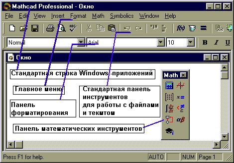 Под интерфейсом пользователя подразумевается совокупность средств графической оболочки Math CAD, обеспечивающих лёгкое управление системой, как с клавишного пульта, так и с помощью мыши. Под управлением понимается и просто набор необходимых символов, формул, текстовых комментариев и т. д., и возможность полной подготовки в среде MathCAD документов (Work Sheets) и электронных книг с последующим их запуском в реальном времени. Пользовательский интерфейс системы создан так, что пользователь, имеющий элементарные навыки работы с Windows-приложениями, может сразу начать работу с MathCAD.