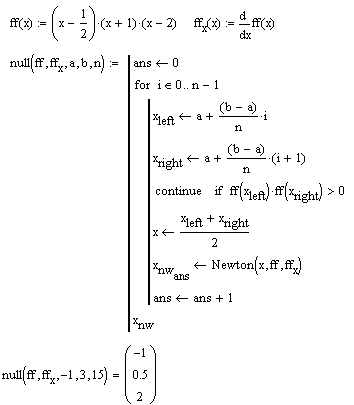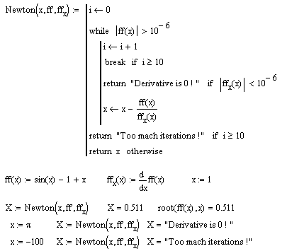 Прерывание цикла при помощи операторов break и continue. Оператор return. Первый пример - релизация метода касательных Ньютона для определения нулей функции. На основе начального значения x вычисляется новое улучшенное значение x, расположенное ближе к искомому нулю функции. При этом итерации повторяются до тех пор, пока значение функции не станет меньше заданной точности (в примере 10-6).