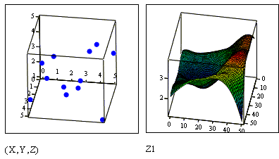 MathCAD позволяет выполнять также МНОГОМЕРНУЮ регрессию, самый типичный случай которой — приближение трехмерных поверхностей. Их можно характеризовать массивом значений высот z, соответствующих двумерному массиву Мху координат точек (х, у) на горизонтальной плоскости.