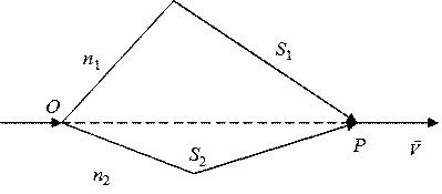 До точки Р первая волна проходит в среде показателем преломления n 1 путь S 1, вторая волна проходит в среде с показателем преломления n 2 путь S 2. Если в точке О фаза колебания равна wt, то первая волна возбудит в точке Р колебание А 1 соsw (t – S 1/ V 1), а вторая волна -колебание А 2 соsw (t – S 2/ V 2), где V 1 и V 2 - фазовые скорости волны в первой и второй средах соответственно. Следовательно, разность фаз колебаний, возбуждаемых волнами в точке Р, будет равна j = w (S 2/ V 2 – S 1/ V 1) = (w / c)(n 2 S 2 – n 1 S 1).