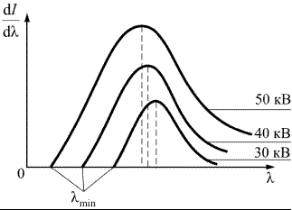 где U – ускоряющее напряжение. Согласно классической электродинамике при торможении электрона должно возникать излучение всех длин волн от нуля до бесконечности. Длина волны, на которую приходится максимум мощности излучения, должна уменьшиться по мере увеличения скорости электронов, что в основном подтверждается на опыте (рис. 18.6). Заметное излучение рентгеновского диапозона наблюдается лишь при резком торможении быстрых электронов, начиная с U ~ 50 кВ, при этом V 0 ≈ 0,4 c (с – скорость света). В индукционных ускорителях электронов – бетатронах, электроны приобретают энергию до 50 МэВ, V 0 = 0,99995 с. Направляя такие электроны на твердую мишень, получают рентгеновское излучение с малой длиной волны. Это излучение обладает большой проникающей способностью.
