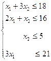 Методичні вказівки Складемо оптимізаційну модель задачі. Позначимо: x1, x2 – число одиниць продукції відповідно P1 і P2, запланованих до виробництва. Для їхнього виготовлення (табл. 1) буде потрібно (1* x1+3* x2) одиниць ресурсу S1, (2* x1+1* x2) одиниць ресурсу S2, (1* x2) одиниць ресурсу S3, (3* x1) одиниць ресурсу S4. У наслідок того, що споживання ресурсів S1, S2, S3, S4 не мусить перевищувати їхніх запасів, відповідно 18, 16, 5 і 21 одиниць, то зв'язок між споживанням ресурсів і їхніх запасів виражається системою обмежень: