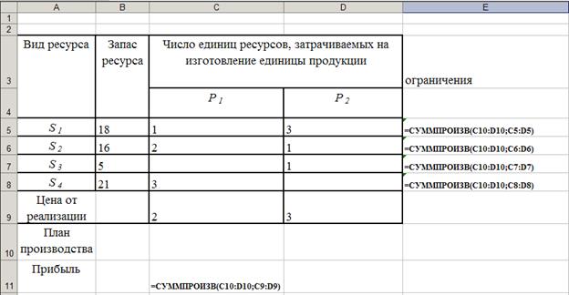 У чарунку D9 уводимо цільову функцію: СУММПРОИЗВ (D7:E7;D8:E8).