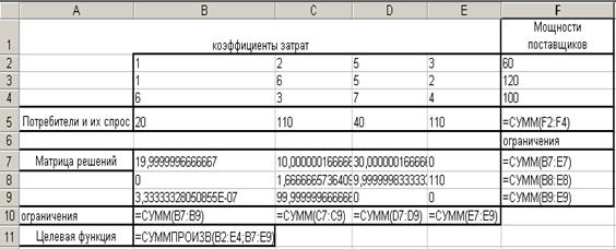 Уводимо в діапазон B2:E4 коефіцієнти витрат на перевезення, у діапазон B5:E5 уводимо потреби у вантажах, у діапазон F2:F4 уводимо потужності постачальників. У чарунку F5 для перевірки типу транспортної задачі уводимо формулу: =СУММ(F2:F4)