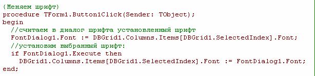 У сетки DBGrid имеется свойство Columns, которое содержит столбцы. Щелчок по этому свойству как раз и откроет редактор столбцов сетки. Столбцы хранятся в свойстве Items в виде массива и имеют индексы от 0 до DBGrid1.Columns.Items.Count-1. Заметим, что свойство Items используется по умолчанию, и его можно не указывать: DBGrid1.Columns[0] = DBGrid1.Columns.Items[0] Шрифт и цвет можно менять не только в Инспекторе объектов, но и программно. Добавим на форму две кнопки, на которых напишем "Шрифт" и "Цвет". А также два диалога: FontDialog и ColorDialog. Создадим процедуру нажатия на первую кнопку и впишем в нее следующее: