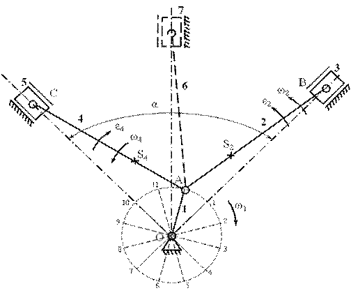 Для выбора заданного положения кривошипа траектория перемещения точки А (окружность) разбивается на 12 равных частей от начала отсчета, в качестве которого чаще всего принимается положение точки А на линии ОВ. Отсчет положений точки А (по часовой или против часовой стрелки) производится в зависимости от заданного направления вращения кривошипа. Положение точек В и С на линии ОВ и ОС находим методом «засечек» циркулем, установленным в точку А и содержащим размер звеньев АВ и АС, в принятом масштабе. На звеньях АВ и ВС необходимо указать положение их центров масс (отношение AS2/AB в соответствии с заданием). Размеры прямоугольников, изображающих поршни компрессора 3 и 5, могут не соответствовать их действительным размерам и выбираются произвольно, как условное изображение поступательно движущихся звеньев.