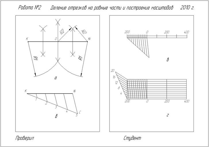 Работа № 2. Деление линий на равные части и построение масштабов Деление линий на равные части (рисунок 3 а, б) Цель. Разделить линии на равные части. Содержание. На форматке стандартного размера, разделив рабочее поле пополам, выполнить в левой части упражнение по делению отрезка произвольной длины на четное и нечетное число равных отрезков (рисунок 3). 1. Для деления линии на четное число равных отрезков применяют способ засечек. Из концов линии КК1 (см. рисунок 3 а) при помощи кругового циркуля или циркуля-измерителя проводят дуги радиусом более ее половины. Точки пересечения дуг соединяют прямой, которая делит линию КК1 пополам в точке О. Если описанное действие повторить для линий КО и ОК1, то получим четыре равных отрезка. 2. Для деления отрезка на произвольное (нечетное) число равных отрезков применяют способ боковой вспомогательной линии. Под острым углом к линию КК1(рисунок 3б) проводят вспомогательную, более длинную линию КС, на которой циркулем-измерителем откладывают заданное число равных отрезков. Крайнюю точку С размеченной таким образом линии соединяют с точкой К1.. При помощи линейки и треугольника проводят через точки разметки линии, параллельные СК1 до пересечения с линией КК1. Требования: получить точки, разделяющие линию КК1 на заданное число равных отрезков. Описанные приемы деления линий можно использовать при выполнении работы по построению линейного и поперечного масштабов. Построение масштабов (рисунок 3 в, г) Цель. Освоить на практике навыки по разметке и делению линий при построении и вычерчивании линейного и поперечного масштабов. Содержание. В правой части рабочего поля форматки построить и вычертить линейный и поперечный масштабы 1:10 000. Для построения линейного масштаба (рисунок 3 в) вычерченную горизонтальную линию делят на заданное число равных отрезков (в данном случае на шесть), называемых основанием масштаба. Для масштаба 1:10 000 основание равно 1 см. Из концов отрезков восстанавливают перпендикуляры длиной 2 мм. Два левых отрезка (т. е. удвоенное основание) приемом боковой вспомогательной линии делят на десять равных частей и из концов каждого отрезка восстанавливают перпендикуляры длиной 1,5 мм. Каждую десятую часть еще раз делят пополам, восстанавливая штрихи длиной 1 мм. Указания. Для построения поперечного масштаба (рисунок 3 г) на горизонтальной линии откладывают отрезки (основание) длиной 2 см. Из точек деления восстанавливают перпендикуляры длиной 2 см (длина перпендикуляров может быть и произвольной). Полученные точки соединяют. Боковые стороны левого прямоугольника делят на десять равных отрезков приемом боковой вспомогательной линии и соединяют точки деления тонкими линиями, параллельными основанию. Нижнюю и верхнюю стороны прямоугольника также делят на десять равных отрезков и соединяют наклонными линиями. Требование. Окончательное оформление выполняют так, как показано на рисунке 3.
