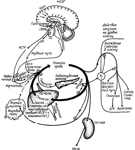 Обозначения: ─подавление; +усиление; CRH – кортиколиберин; ACTH – кортикотропин; GH – гормон роста; Ri – рецептор инсулина; SS – соматостатин