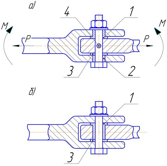 Следует стремиться к уменьшению количества поверхностей трения, т.е. выполнять соединение, как показано на рис. 6.3, а, либо на рис. 6.3, б. Неподвижность болта относительно уха (рис. 6.3,а) или проушины вилки (рис. 6.3,б) обеспечивается за счет большего трения в соединении, затяжки болта или его специальной фиксации (рис. 6.3,а, поз 4). Если соединяемые элементы нагружены только осевой силой (рис. 6.3,а), существенной разницы в работе приведенных вариантов нет. Однако более технологичным является соединение на рис. 6.3,б, так как в этом случае проще выполнить приторцовку втулок точно под размер паза. Если соединяемые элементы нагружены изгибающим моментом М, очевидными достоинствами обладает вариант на рис. 6.3,а. В этом случае усилия смятия, возникающие в подвижном соединении, меньше. По этой причине нужно стремиться к увеличению расстояния между проушинами вилки. При конструировании проушин с втулками нужно отдавать предпочтение стандартным втулкам. Номенклатура втулок и их параметры определены в стандартах [5 - 9]. Втулки устанавливаются в проушины по прессовой посадке Н7/u8 … Н9/u8. Втулки обычно изготавливаются из бронзы БрАЖМц, а для сильно нагруженных соединений из стали 30ХГСА. Если втулка изготовлена из бронзы (σв ≈ 600МПа), то её длина и, следовательно, толщина проушины получаются достаточно большими. Для уменьшения габаритов соединения в таких случаях выгодно применять полые замыкающие элементы с увеличенным внешним диаметром, но расчетной площадью сечения.