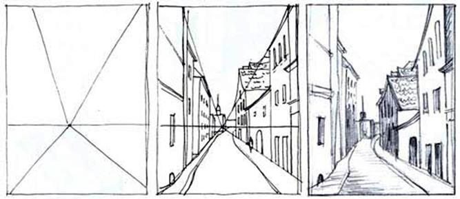 Построение изображений городских ансамблей производят по тем же правилам и законам перспективы, что и рисунков геометрических тел, интерьеров и других сложных форм в пространстве. Согласно этим законам, определяется взаимосвязь пространственных планов с горизонтом и точкой схода и предметами, находящимися в пространстве. В отличие от рисования интерьера экстерьерные рисунки позволяют свободнее и шире решать пространственную среду в картиной плоскости, следовательно, возникает необходимость в передаче воздушной перспективы. Воздушной перспективой называют иллюзию пространственной глубины, когда предметы, по мере удаления от рисующего, изменяются не только в размерах, но и по цветовой и тоновой контрастности, т.е. они становятся все менее контрастными, как по цвету, так и по тону.
