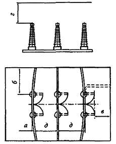 4.2.17. Электрооборудование, токоведущие части, изоляторы, крепления, ограждения, несущие конструкции, изоляционные и другие расстояния должны быть выбраны и установлены таким образом, чтобы: 1) вызываемые нормальными условиями работы электроустановки усилия, нагрев, электрическая дуга или иные сопутствующие ее работе явления (искрение, выброс газов и т.п.) не могли причинить вред обслуживающему персоналу, а также привести к повреждению оборудования и возникновению короткого замыкания (КЗ) или замыканию на землю; 2) при нарушении нормальных условий работы электроустановки была обеспечена необходимая локализация повреждений, обусловленных действием КЗ; 3) при снятом напряжении с какой-либо цепи относящиеся к ней аппараты, токоведущие части и конструкции могли подвергаться безопасному техническому обслуживанию и ремонту без нарушения нормальной работы соседних цепей; 4) была обеспечена возможность удобного транспортирования оборудования. 4.2.18. При использовании разъединителей и отделителей при их наружной и внутренней установке для отключения и включения токов холостого хода силовых трансформаторов, зарядных токов воздушных и кабельных линий электропередачи и систем шин необходимо выполнять следующие требования: 1) разъединителями и отделителями напряжением 110 - 500 кВ независимо от климатических условий и степени промышленного загрязнения атмосферы при их наружной установке допускается отключать и включать ток холостого хода силовых трансформаторов и зарядные токи воздушных и кабельных линий, систем шин и присоединений, которые не превышают значений, указанных в табл. 4.2.1; 2) разъединителями и отделителями напряжением 110, 150, 220 кВ при их внутренней установке со стандартными расстояниями между осями полюсов соответственно 2; 2,5 и 3,5 м допускается отключать и включать токи холостого хода силовых (авто) трансформаторов при глухозаземленной нейтрали соответственно не более 4,2 и 2 А, а также зарядные токи присоединений не более 1,5 А; 3) указанные на рис. 4.2.1. расстояния по горизонтали а, б, в от колонок и концов горизонтально-поворотных (ГП) подвижных контактов в отключенном положении до заземленных и токоведущих частей соседних присоединений должны быть не меньше расстояний между осями полюсов д, указанных в табл. 4.2.1 и 4.2.2. Эти требования к расстояниям а, б, в по рис. 4.2.1 применимы и к разъединителям и отделителям напряжением 110 - 220 кВ при их внутренней установке по п. 2. Расстояния по вертикали г от концов вертикально-рубящих (ВР) и ГП подвижных контактов до заземленных и токоведущих частей должны быть на 0,5 м больше расстояний д; 4) разъединителями и отделителями 6 - 35 кВ при их наружной и внутренней установке допускается отключать и включать токи холостого хода силовых трансформаторов, зарядные токи воздушных и кабельных линий электропередачи, а также токи замыкания на землю, которые не превышают значений, указанных в табл. 4.2.2 (см. рис. 4.2.1) и табл. 4.2.3 (рис. 4.2.2, а и б). Размеры изолирующих перегородок для стандартных трехполюсных разъединителей приведены в табл. 4.2.4 в соответствии с рис. 4.2.2, а и б; 5) у разъединителей и отделителей, установленных горизонтально, спуски из гибкого провода прокладывать полого во избежание переброски на них дуги, не допуская расположения, близкого к вертикальному. Угол между горизонталью и прямой, соедин