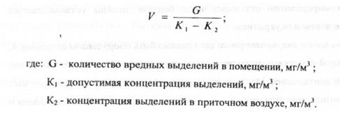 Для общеобменной вентиляции объем приточного воздуха (V) при удалении вредных выделений, пыли или газа можно определить по формуле: