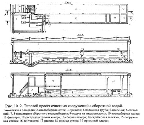 Основой очистных сооружений служат три железобетонные трубы с внутренним диаметром 2500 мм. и высотой 2150 мм. (рис. 10. 1.). Загрязненная вода по стокам поступает в грязеотстойники 1 и 11. В грязеотстойниках частицы масла всплывают на поверхность воды и собираются в маслосборный лоток, а затем перекачиваются в маслосборную емкость. Более тяжелые загрязняющие вещества оседают на дно грязеотстойников. Отстоявшаяся в грязеотстойниках вода проходит через фильтры и поступает в отстойник 111 и затем выпускается в водосток муниципальной ливневой канализации. Для изготовления фильтров используется стружка деревьев лиственных пород, уложенная в несколько слоев с прокладками из мешковины. Набивка фильтров меняется летом и зимой один раз в месяц, а осенью и весной - два раза в месяц. Производственная канализация. В процессе осуществления перевозок подвижной состав автомобильного транспорта загрязняется вследствие налипания дорожной грязи, состоящей из частиц асфальта, глины и песка, оседания частиц сажи и других химических соединений, входящих в состав выхлопных газов, попадания масла, бензина и других эксплуатационных материалов при техническом обслуживании, ремонте и эксплуатации автомобилей. Степень загрязнения подвижного состава зависит от условий эксплуатации, погодных условий, типа подвижного состава, вида перевозок и т. д. Масса загрязнений автомобиля за день работы на линии может составить от 2 до 20 кг. Нетрудно подсчитать, что, масса грязи, очищаемая за год в процессе выполнения уборочно-моечных работ в автотранспортном предприятии, эксплуатирующем 250 автомобилей-самосвалов КамАЗ, МАЗ, КрАЗ на дорогах с щебеночным и гравийным покрытием может колебаться в пределах 400-800 тн. Чтобы смыть такое количество грязи приходится израсходовать от 100 тыс. до 150 тыс. куб. м. воды. Естественно, попадание такого количества неочищенных стоков со значительным содержанием вредных веществ от предприятий в городскую канализацию может привести к экологической катастрофе. В целях рационального использования водных ресурсов, охраны окружающей среды и сокращения материальных затрат на предприятиях автомобильного транспорта при мойке автомобилей используется оборотное водоснабжение (исключением являются автомобили ассенизационные и перевозящие ядовитые и инфицирующие вещества, для которых запрещено предусматривать оборотное водоснабжение). При оборотном водоснабжении вода после мойки автомобилей очищается и отстаивается в очистных сооружениях предприятия, откуда насосами повторно подается на мойку. Оборотное водоснабжение позволяет сократить расход водопроводной воды на 80 - 90 %. Очистка производственных сточных вод в зависимости от компонентов, входящих в состав загрязнений и концентрации загрязняющих веществ может производиться механическими, химическими, химико-физическими и биологическими методами. Наибольшее распространение для очистки производственных стоков после мойки автомобилей получил механический метод, как наиболее дешевый и эффективный. Используется также и химико-физический (флотационный) метод. Флотационный метод очистки основан на искусственном насыщении очищаемой воды пузырьками воздуха, которые, прилипая к частицам масла, нефти и других загрязнений способствуют их всплытию на поверхность вод. Для поднят