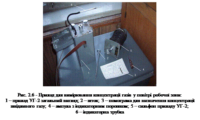 Визначення допустимості умов праці виконують після проведення експерименту методом порівняння величини С з ГДК. Якщо концентрація С < ГДК, то умови праці приймають, як допустимі. Загальний вигляд приладу УГ-2 для визначення концентрації газу лінійно-колористичним методом наведено на рис. 2.6.