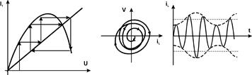 Решение системы уравнений может быть представлено графически на плоскости состояния. Рассмотрение процессов в автоколебательных цепях на плоскости состояния часто оказывается более наглядным, чем в другой форме. Рассмотрим примеры, показывающие взаимосвязь характеристики и линии ОС с траекторией на плоскости состояния и осциллограммы процессов, полученных численным решением уравнений состояния.