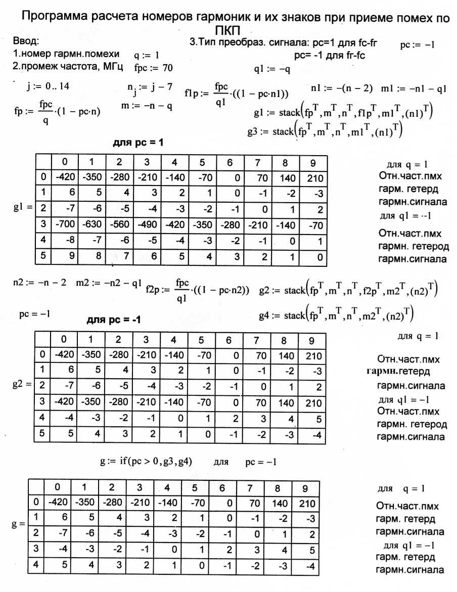 Отметим, что в курсе радиовещательных приемников в отличие от РРС полоса ПКП определяется полосой пропускания УПЧ. «Программа расчета номеров гармоник и их знаков при приеме помех по ПКП» приведена ниже в Пр. 3.1. В программу вводятся: номер гармоники помехи, промежуточная частота и тип преобразования сигнала, аналогичный принятому в (3.7) Результаты расчета представлены тремя матрицами: g1 для преобразования сигнала рс = 1, g2 для рс = -1, g для рс = -1, являющейся модификациией g2 и g1. В строках матрице g2 приводятся следующие данные: 1. в 0 строке- частота помехи на входе ПРЧ относительно частоты гетеродина для положительных значений q; 2. в 1-ой строке - гармоника гетеродина и ее знак, образующая ПКП; 3. во 2-ой строке - гармоника сигнала и ее знак; 4. в 3-ей строке повторяются относительные частоты помех, для которых выполняется расчет для других гармоник гетеродина и сигнала, приводимых в 5 и 6 строках вышеупомянутой матрицы для отрицательных значений q. Повторный ввод в 3 строке был сделан для удобства контроля синхронизации частот ПКП с другими гармониками, образующими комбинационные частоты равные ПЧ. Аналогичная синхронизация сделана в матрице g1 для преобразования сигнала рс =1. В этом случае пользователю не нужно разыскивать другие столбцы с теми же частотами ПКП, но с другими типами преобразований частот