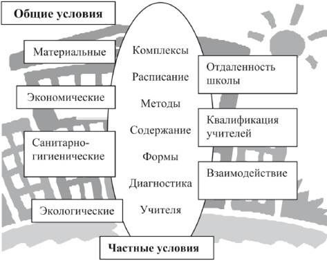 Рис. 15. Общие и частные условия эффективности работы в малокомплектной школе – отдаленность школы (возможности приема телепрограмм, повышения квалификации учителей, методической и инспекторской помощи и т.д.); – квалификация учителей; – взаимодействие (с дошкольными учреждениями, средней школой, администрацией населенного пункта, родителями). Все эти условия мало зависят от учителей, но они задают те принципиальные возможности, которые определяют уровень работы школы, качество обучения и воспитания. Если в классе холодно, нет в достаточном количестве нужных книг, а из-за расположенного рядом шиферного завода трудно дышать, надеяться на высокое качество учебно-воспитательного процесса трудно. Однако учителя могут влиять на те условия, которые создают они сами. Все зависит от их добросовестного отношения к делу. К таким конкретным условиям относятся: – рациональное объединение классов в комплекты; – правильное составление расписания уроков; – выбор эффективных методов обучения, воспитания, правильное сочетание их в технологическом процессе; – определение наиболее целесообразной структуры урока в соответствии с поставленной целью; – оптимизация содержания урока; – правильное сочетание урочной и внеурочных форм учебно-воспитательной работы; – рациональное чередование самостоятельной работы учеников с работой под руководством учителя; – формирование у детей умения учиться и самостоятельно приобретать знания; – рациональное использование наглядности и слова на различных этапах изучения знаний, формирования умений; – научная диагностика развития, уровня обученности и воспитанности школьников; – систематический контроль знаний, умений, основанный на принципах гуманистической педагогики; – разумное руководство разновозрастными объединениями детей; – применение технических средств обучения; – использование личностно-ориентированного обучения и воспитания. При соединении классов в комплекты исходят из того, сколько: 1) классов; 2) в каждом из них учеников; 3) учителей в школе. Если в школе один учитель, вариантов нет: он объединяет все классы в один комплект. Если два-три учителя, они могут создавать комплекты, руководствуясь соображениями: а) равного числа учеников; б) личных наклонностей; в) педагогической целесообразности. Учитываются также: • сложность программы в каждом классе; • уровень подготовленности учеников; • опыт и квалификация педагога; • преемственность в работе (сохранить ее или, наоборот, не принимать во внимание); • нагрузка, которую имел классовод в предыдущем году; • размер классной комнаты и др.
