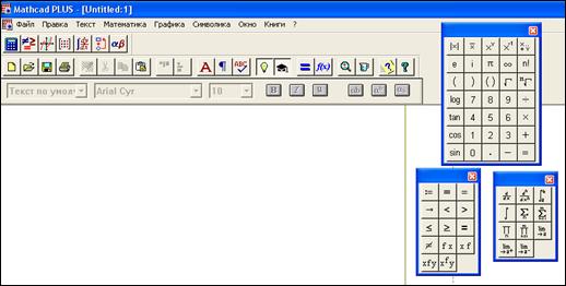 Окно системы Mathcad похоже на окна других программ, функционирующих под управлением операционной системы Windows, и содержит набор различных элементов управления. Среди них имеются как стандартные элементы управления объектами Windows (меню, кнопки работы с файлами и окнами, полосы прокрутки и др.), так и специализированные, характерные непосредственно для системы Mathcad (рис. 1).