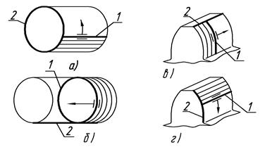 Любую поверхность можно представить как след движения одной линии (образующей) по другой (направляющей). Обе эти линии называют производящими, причем образующая может быть направляющей, и наоборот. Например, круговая цилиндрическая поверхность может быть представлена как след движения прямой линии по окружности (рис.6,а) или след движения окружности по прямой (рис.6,б). Боковую поверхность зуба прямозубого цилиндрического колеса можно рассматривать как след движения эвольвенты вдоль прямой линии (рис.6,в) или след движения прямой по эвольвенте (рис.6,г). Таким образом, с геометрической точки зрения процесс образования поверхности сводится к осуществлению движения одной производящей линии по другой. Производящие линии на станках образуются материальными точками и линиями режущей кромки инструмента за счет согласованных относительных движений заготовки и инструмента. Причем следует подчеркнуть, что почти все производящие линии на станках непрерывно образуются (имитируются) в течение всего времени формирования поверхности. В процессе непрерывной имитации обеих производящих линий и формируется с помощью резания требуемая поверхность. Согласованные относительные движения заготовки и режущего инструмента, которые непрерывно создают производящие линии, а следовательно, поверхность заданной формы в целом, называют формообразующими(рабочими) и обозначают буквой Ф. В зависимости от формы производящей линии и метода ее образования движения формообразования могут быть простыми и сложными. К простым движениям формообразования относят вращательное, которое обозначают Ф (В), и прямолинейное – Ф (П). Сложными формообразующими движениями являются те, траектории которых образуются в результате согласованности взаимозависимых двух и более вращательных или прямолинейных движений, а также их сочетаний. Примеры условной записи сложных формообразующих движений: Ф (B 1 B 2), Ф (B 1 B 2), Ф (В 1 П 2 П з) и т. п. Запись двух и более простых движений в одних общих скобках говорит о том, что они зависят друг от друга и тем самым создают единое сложное движение.