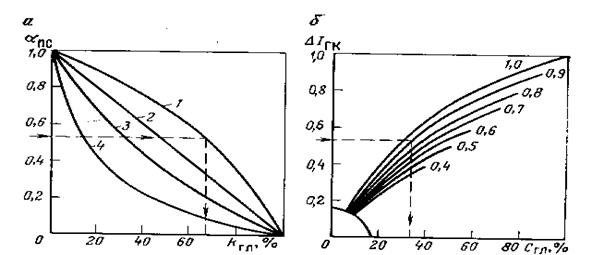 Рис.5.3. Палетки для определения объемной б - кривые зависимости DIГК от СГЛ для палеозойских отложений Волго-Уральской нефтеносной провинции, шифр кривых - содержание глинистых частиц в опорном пласте, характеризующемся максимальными показаниями DIГК Вычисленные значения aпс используют для определения kгл по палетке (рис.5.3,а). Выбор кривой на палетке определяется соотношением rп и rзп исследуемого пласта и rгл пластов, по которым проведена линия глин. Для определения глинистости используют также значения Данные ГК применяют для определения глинистости кварцевых песчаников и карбонатных пород, минеральный скелет которых обладает низкой естественной радиоактивностью. Точность определения глинистости по ПС и ГК невысокая. Поэтому обычно речь идет о примерной оценке глинистости, а не о точном определении самой величины.