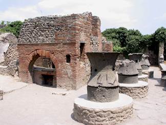 В Помпеях обнаружено 34 пекарни, полностью удовлетворявшие нужды горожан и экспортирующие свою продукцию в соседние поселения. Наиболее известны пекарня Попидия Приска и пекарня на улице Стабий, в которой сохранилось 5 ручных мельниц. Жернова двух типов: один неподвижный конусовидный, другой в форме песочных часов без дна и крышки, надевавшийся на него сверху. В полость верхнего желоба засыпалось зерно, и он приводился в движение рабами или волами. Изготовлены жернова из вулканических пород. Многие пекарни не имели прилавков для продажи хлеба, либо поставляя его оптом, либо разнося по домам или продавая на улице с рук. Также в Помпеях производился рыбный соус «гарум», который в больших количествах шёл на продажу в другие города. Раскопан целый цех по его приготовлению, в котором сохранились амфоры для перевозки продукта. Технология состояла в следующем: рыбу, очищенную от костей и растёртую, выдерживали в солёной (морской) воде в течение нескольких недель. Часто к ней добавляли зелень, пряности, вино. Приправляли им самые разнообразные блюда.