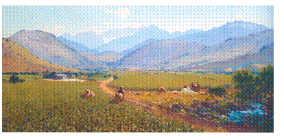 Тему труда У.Тансыкбаев трактует как частное явление, как естественное жизненное пространство, в то время как сама Природа - это сакральное эпическое явление. Претворение соцреализма как генерального направления в советском искусстве находит свой отклик именно в таково рода произведениях, где тема труда, тема природы на поверхностный взгляд соответствуют духу советской идеологии. Вероятно, художник действительно искренне верит социалистическим лозунгам власти страны Советов, верит в грядущие счастливые дни, и понимает, что труд крестьян всегда был на этой земле лишь непременной частью в ее существовании. Главное действующее лицо произведения – пейзаж, с оттенками романтического звучания, с оттенками поэтического восхищения перед ее панорамой, перед перспективными далями ее глубин, что уходят, переливаясь всеми тональными перепадами за горизонт. Как и свойственно национальному характеру, земля воспринимается безграничной, просторной, широкой, где много воздуха, много солнца и, где человек ощущает ее царственное величие. Когда из городской среды вдруг оказаться один на один с природой, в ее почти первозданном, первородном виде, тогда человек собственной кожей ощущает, кто же здесь хозяин положения. В то время как в искусстве соцреализма надо было выразить иную, совершенно противоположную мысль: мысль о превосходстве человека над природой. У.Тансыкбаев тему труда вписывал, вплетал в природную среду, где не могло быть и речи о доминировании людей - органичность крестьянского бытия возможна была только в его традиционной хозяйственной деятельности. Не было в этом ничего героического, это повседневность, другое дело - сакрализация процесса труда, желание наделить и наполнить его особым отношением. Такой подход бытовал в традиционных культурах многих народов. Требования советской идеологии ничего существенно не изменили в отношении художника к данной проблеме: взаимоотношениях человека и земли. Земля всегда была выше, шире и могущественней, человек только добывал своим трудом хлеб насущный, непременно благодаря при том природу матери земли. Все это прочитывается в пейзажах У.Тансыкбаева. Идиллии сельской жизни здесь нет – есть органичность присутствия человека в этой среде. Сбор урожая у многих народов сопровождал приподнятый праздничный настрой. Праздники урожая традиционны для человечества, советская идеология стремится использовать в своих целях, устоявшиеся в народной культуре формы отношения к результатам своей хозяйственной деятельности. Праздничности нет в полотне художника, хлопок, созревший и собираемый людьми, только некая деталь в пространстве пейзажа, в целом ощущение обыденности происходящего не покидает зрителя. Слишком прозаичен эпизод со сбором хлопка, нет в нем никаких следов «битвы» за урожай, зато есть чувство монументальной мощи от общего колористического строя пейзажа. Присутствие человека отражено в изображении проселочной дороги, разделяющей хлопковые поля, изгибы которой «убегают» в глубь пространства, свидетельствуя о его масштабах. Собственно дорога, извивающаяся в самой середине картинной плоскости, больше говорит о человеке, чем те несколько фигур, что заняты сбором этого урожая. Труд очень тяжелый, людей немного, а поле большое и сбор только начинает набирать обороты. Прис
