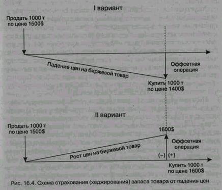 Производители, изготовившие товары для продажи, или предприниматели, купившие реальный товар для перепродажи, могут опасаться финансовых потерь от падения на него рыночных цен. Применение фьючерсных операций позволяет застраховаться от потерь. Для этого предприниматель обращается к брокеру с поручением продать такое же количество товара, которое находится на его складе, с поставкой через период, равный предполагаемому сроку реализации товара. В нашем примере (рис. 16.4, вариант I) предприниматель поручает брокеру продать 1000 т алюминия по цене 1500 долл. с поставкой через 6 месяцев. Допустим, что за этот период цена алюминия на рынке действительно снизилась до 1400 долл. и предприниматель теряет 100 тыс. долл. Тогда он даст указание брокеру купить 1000 т алюминия по 1400 долл., предъявляет оба контракта в расчетную палату биржи и получает 100 тыс. долл. для компенсации своих потерь. Единственное, что он потеряет — двухразовую выплату вознаграждения брокеру, составляющую доли процента от стоимости товара. Рассмотрим вариант II, когда цена хеджированного товара не упала, а возросла, например до 1600 долл. Тогда предприниматель выручит от реализации товара на рынке на 100 тыс. долл. больше, Но он не может не совершить оффсетную операцию до конца срока поставки товара по контракту, т е. купить те же 1000 т алюминия, но по возросшей цене, а значит, потерять на покупке те же 100 тыс. долл. Таким образом, выгода компенсируется вынужденной потерей на оффсетную операцию. В конце концов предприниматель ничего не выигрывает и не проигрывает, но платит те же доли процента брокеру за совершение двух противоположных операций.