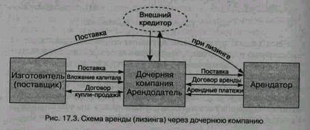 Такая организация арендных операций применяется чаще всего, когда объем сбыта через аренду составляет значительную долю в общем объеме выпускаемой продукции. Состав ее участников и коммерческие связи представлены на рис. 17.3.