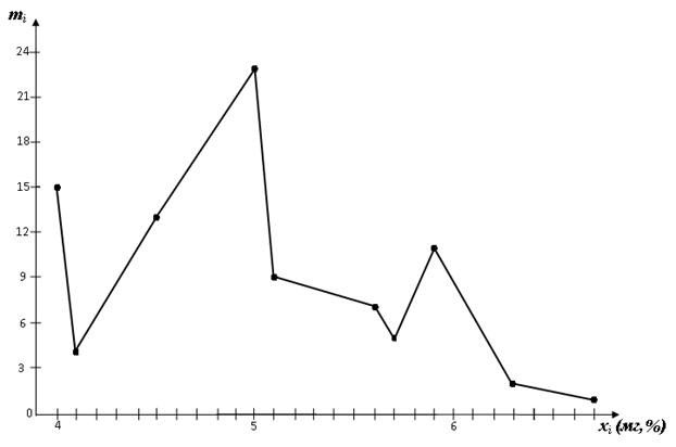 Мода: М0 =5,0 (мг,%) Используя данные таблицы, строим полигон частот:
