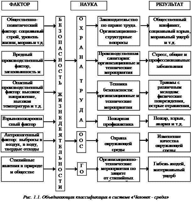 И если старые системы были построены от оборудования, от технологии, от опасных и вредных факторов, то в новой системе человек занимал центральное место, как «мера всех вещей», как самоцель развития общества. Например, предлагалось строить БЖД в виде системы, где в центре стоит человек, объединяя все воздействующие на него факторы (рис. 1.1). Общую неудовлетворенность построением новой дисциплины выразил ведущий специалист в области БЖД профессор О.Н Русак, который отмечает в одном из своих докладов (1994 г.), что в ней не развита общая теория безопасности, отсутствуют четкие концепции безопасности, не определена терминология, противоречивы философские и мировоззренческие концепции БЖД.